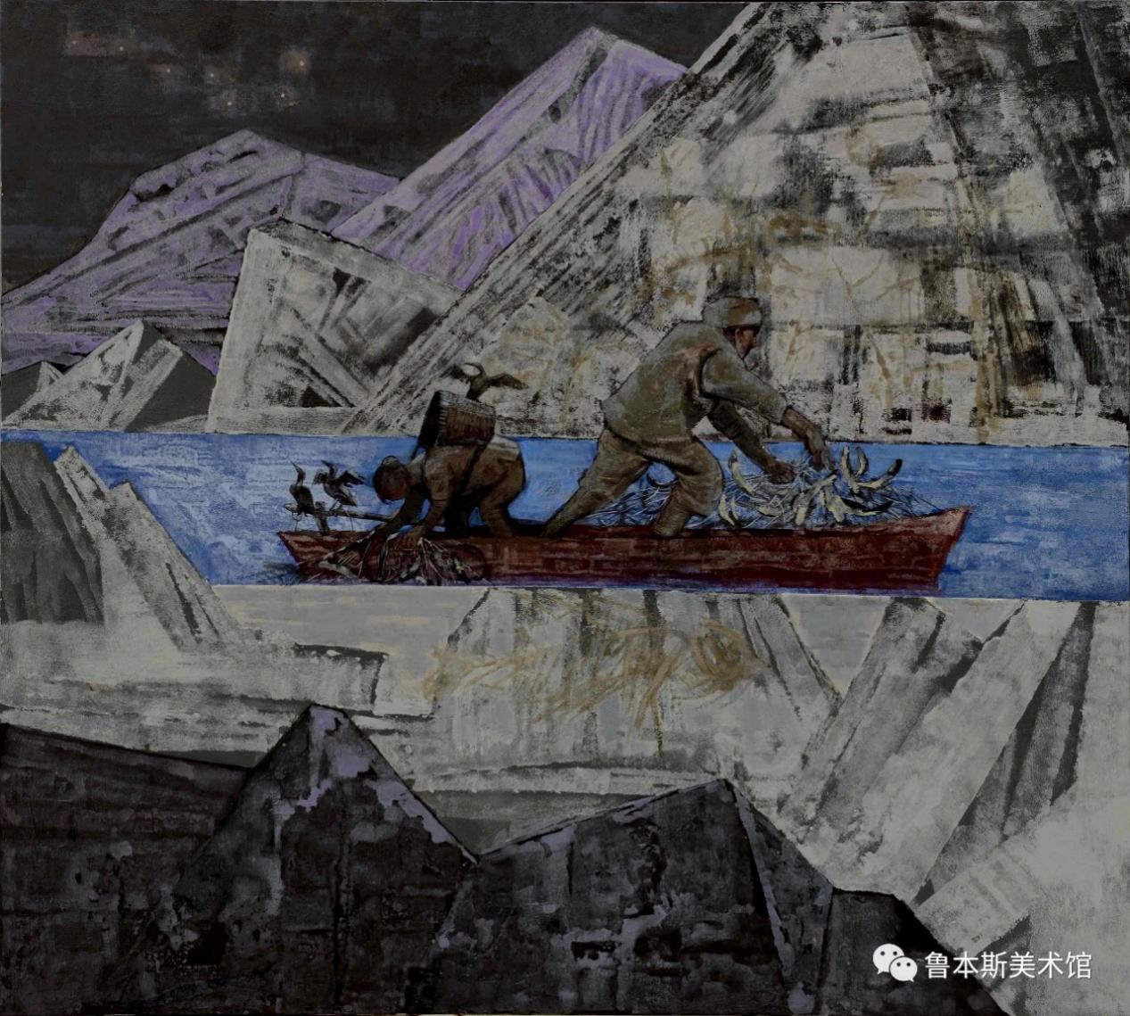 在这幅作品的描绘中,作者以浑厚的笔触与自然的肌理做出了沧桑、坚韧的视觉体验,图中两位捕鱼人专注于收网的工作,体现出他对捕鱼工作流程的全情投入,认真完成捕鱼任务的这一环节,没有因为夜晚的疲惫或者其他因素而懈怠。展现出对捕鱼工作的专注和坚守,这些行为都可以体现出他们在工作中的敬业精神。敬业即是对工作精益求精的态度,同时又是强烈的责任感与使命感的外在体现,在画面中的两只鸟也为画面增添了一丝活跃的氛围,也体现出了人与自然的和谐共处。
