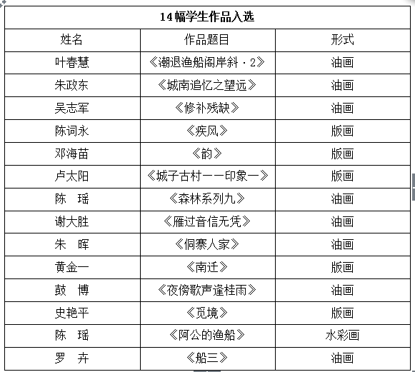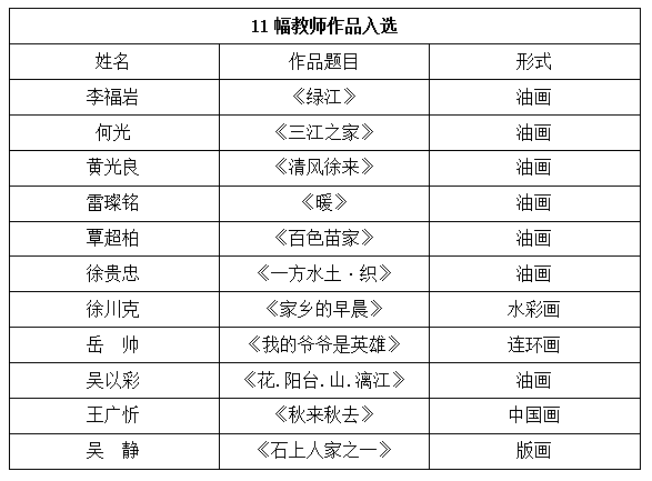 2016年12月5日,由广西壮族自治区人民政府主办,自治区党委宣传部、自治区工业和信息化委员、自治区文化厅等部门承办的2016年广西艺术作品展览启动仪式在广西美术馆举行。此次展览分为3个门类,分别是第四届广西美术作品展、第四届广西书法(篆刻)作品展览和第五届广西工艺美术作品展览。在第四届广西美术作品展所展出的200件美术作品中,美术学院师生共有25幅美术作品入选,成绩优异,为学校赢得了荣誉。详细信息参见下表。