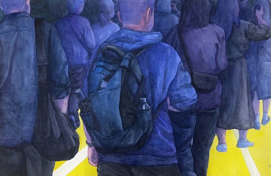 大量的人的存在本应是热闹的,但我在水彩画创作中使用蓝色、紫色大量的冷色调。冷色调给人感觉是清冷的、孤寂的,用清冷的冷色调来表现热闹的人群,也是我在安排画面的巧思之一,我希望以这样一种独特的对比可以带给观者不一样的视觉感受。同时,画面中也搭配少量的对比色来点亮画面。因为本人在水彩画创作中一直比较倾向于使用纯度高的色彩,在此基础上想要追求色调的相对统一。