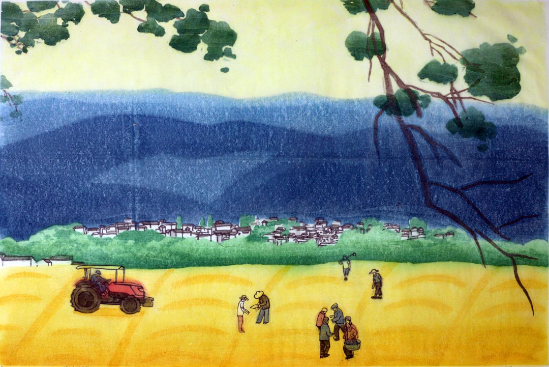 中秋节由祭祀土地神演变而来。在农耕社会,农作物对于农民至关重要。在秋季收获时,农民会祭祀土地神,农历八月十五正好是农作物收获的时节,因此逐渐演变成中秋节。中秋节对国人意味着团圆和丰收,是国人特有的情节,预示着家族兴旺,亲情和睦相处,以及邻里之间的互相帮助。画面中的人们在那片金黄色的土地上相互交谈,像是讲述着粮食丰收和生活蒸蒸日上的喜悦。淡黄的天空、金黄的土地、远处的高山、错落有致的房子、运作的拖拉机、交谈的人们在中秋节日的渲染下显得更加诗意温馨,充满希望。让人联想到了《仲秋》这首诗歌中所写道:“八月中秋秋收忙,丰收佳节喜气洋。万亩沃土创高产,千顷良田有机粮。喜看稻黍千重浪,笑闻瓜果十里香。层林尽染皆秋色,万山红遍好风光。”
