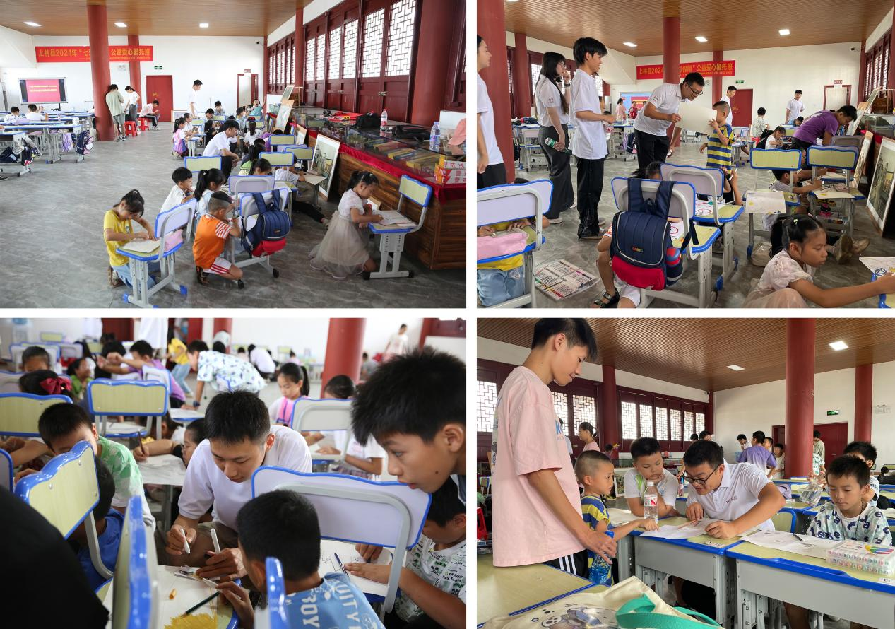 作为“同心绘梦”乡村美育志愿服务活动的延续,实践团联合上林县团委,在壮族老家博物馆为暑托班的孩子们带来了一场别开生面的画展互动教学。通过展示优秀作品、讲解绘画知识、指导临摹创作,实践团成员们不仅激发了孩子们的艺术兴趣,更在他们心中种下了艺术的种子,为乡村美育事业添砖加瓦。
