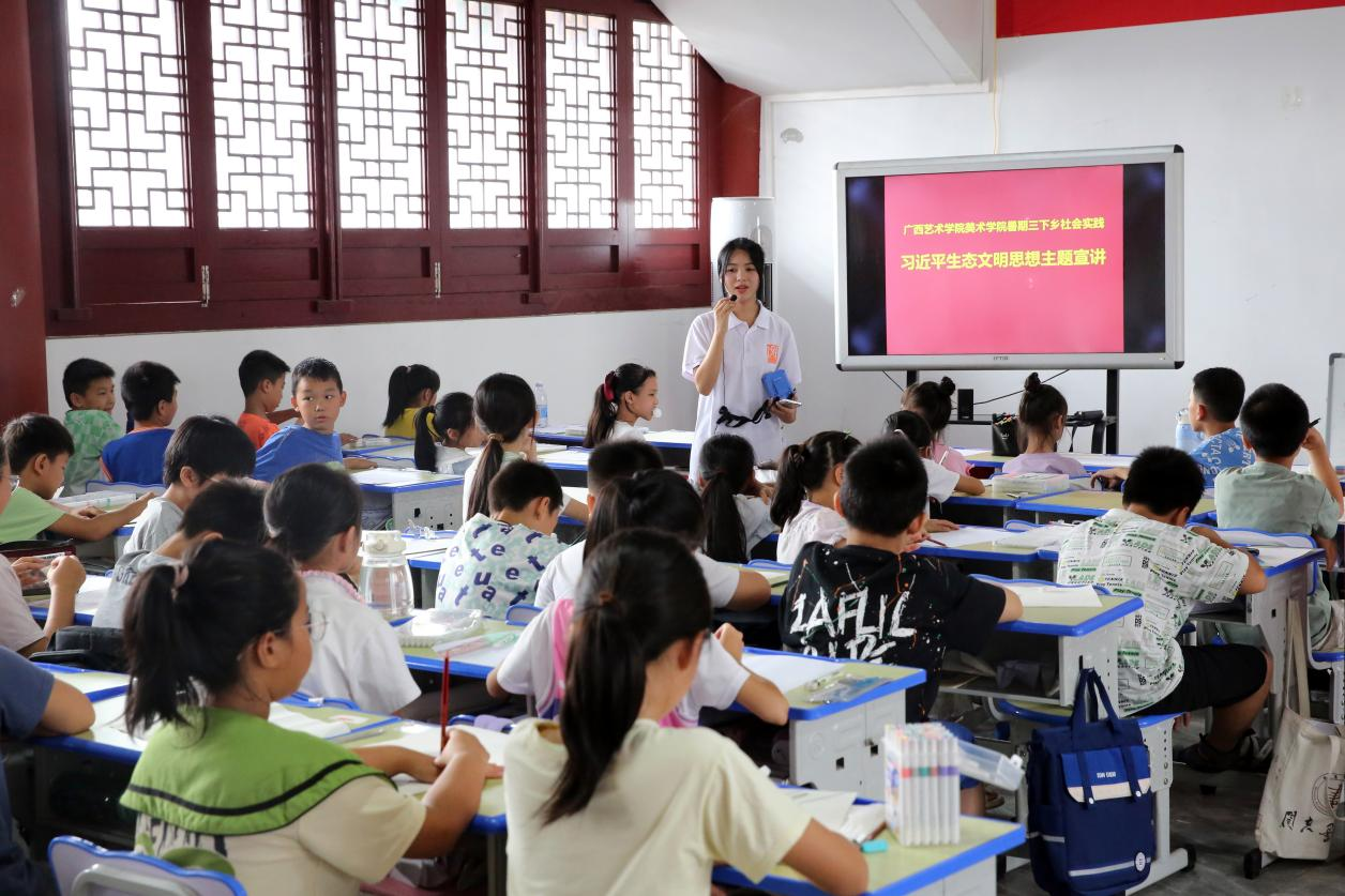 在画展开始前,实践团成员还为孩子们带来了一场生动的生态文明宣讲。他们用通俗易懂的语言介绍了生态文明的重要性,引导孩子们树立环保意识,积极参与生态文明建设。这场宣讲不仅加深了孩子们对生态文明的理解,也为他们未来的成长道路指明了方向。