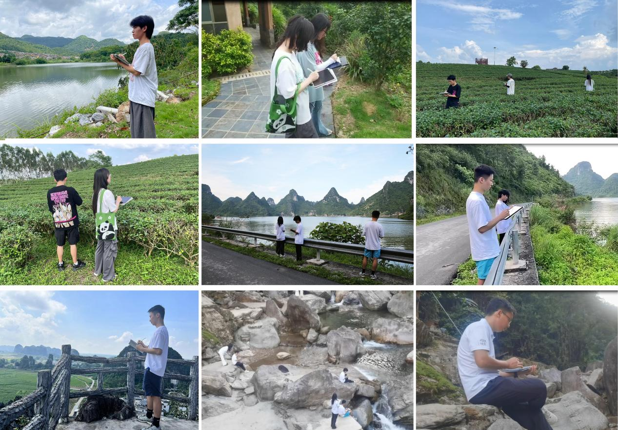 结合前期《徐霞客游广西》的成功经验,实践团精心策划了《徐霞客游上林》绘本创作项目。四天时间里,团队成员深入上林各大风景名胜区,将所见所感融入笔端,创作出一幅幅生动形象的绘本草图。这些作品不仅是对上林美景的艺术再现,更将成为推广当地旅游文化的有力载体。考察期间,成员们对大自然的鬼斧神工连连赞叹,切实感受到了上林生态旅游资源的多样性。置身山水间,成员们更深刻领悟了习近平生态文明思想的深远意义。